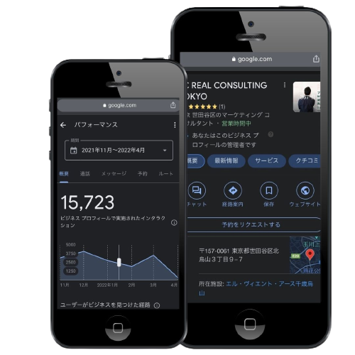 はい。ご導入いただきますと、GBPインサイト内の、①間接検索数、②マップ経由の閲覧数が増え、③ルート検索数、④電話数が増えていきます。