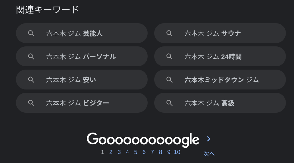 画像は、六本木×ジムで検索した場合の、パソコンの場合は1ページ目最下段、スマートフォンの場合は検索結果の真ん中ぐらいに出てくるものです。(ダークモードのスクショだと黒背景で見やすいですね!)